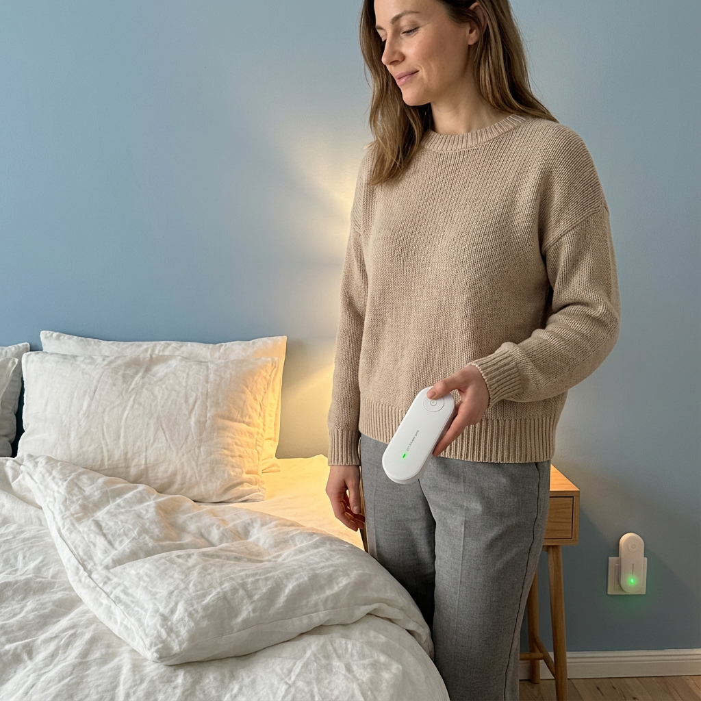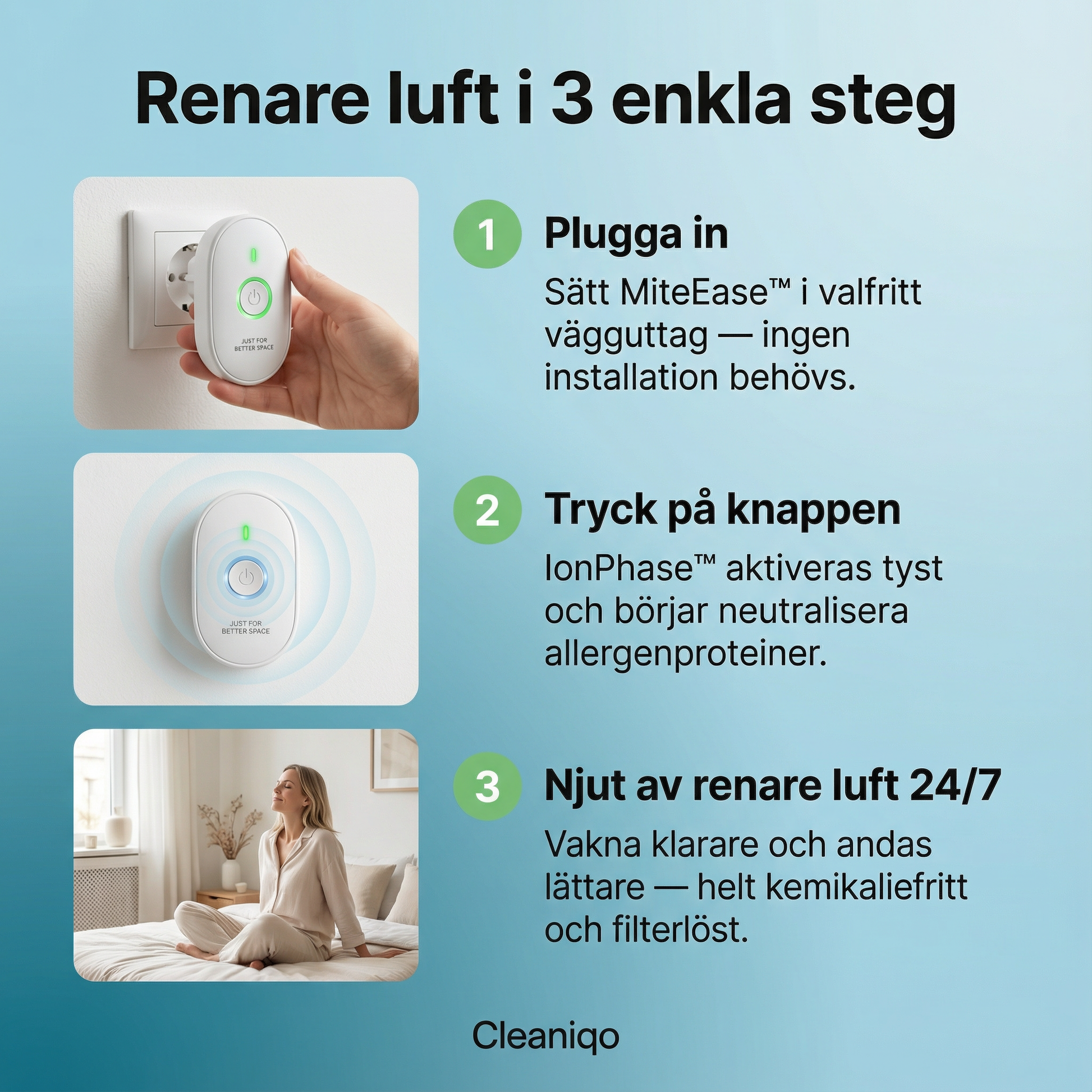 Upplev hur enkelt det kan vara att få klarare morgnar och allergifria nätter med Cleaniqo MiteEase™. Bara plugga in den i valfritt rum – så börjar den tyst och helt automatiskt neutralisera de osynliga allergenproteinerna som orsakar nästäppa, nysningar och orolig sömn. Inga filter, inga dofter, inget underhåll. Bara renare luft och en tryggare känsla i varje andetag.