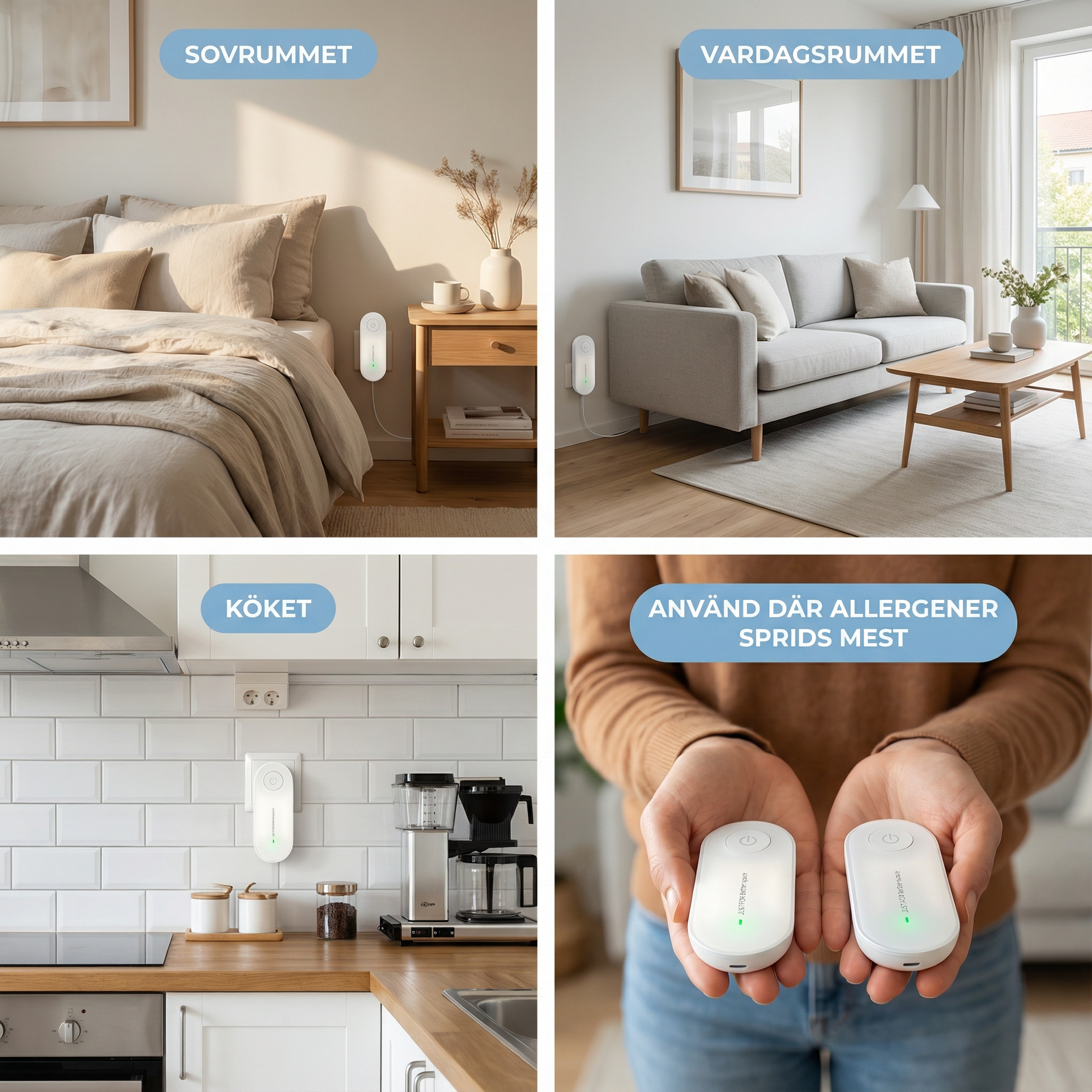 Neutraliserar allergenproteiner – Tar bort det som vanliga luftrenare och städning inte rår på.